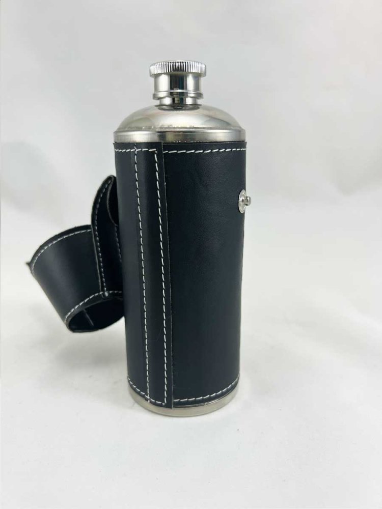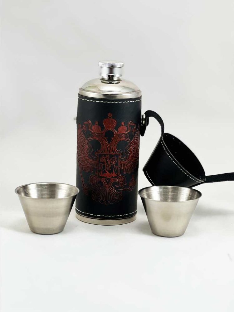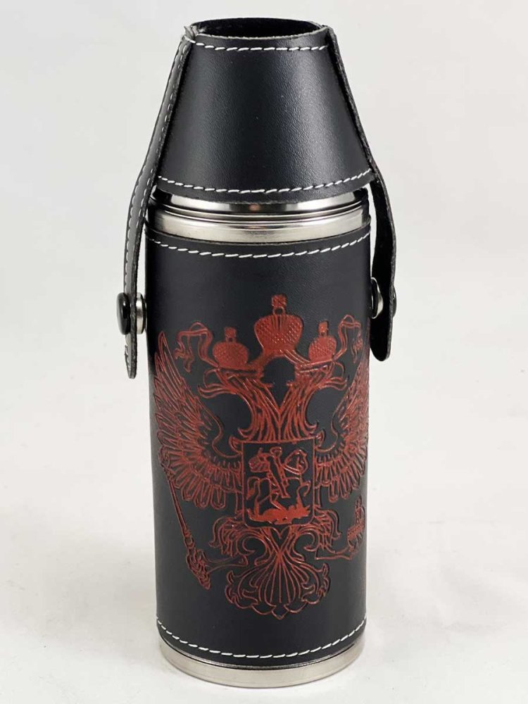 Фляжка металлическая цилиндрическая, с двумя стопками, герб России