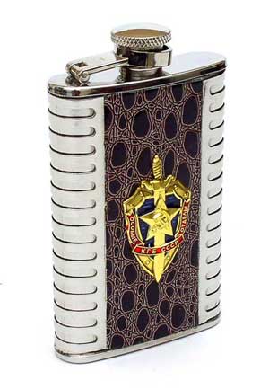 Фляжка небольшая металлическая с гербом КГБ СССР. Помещается в небольшой карман. Отличный подарок для мужчины. Кожаная вставка с двух сторон. Крышка внутри с пластмассовой прокладкой от протекания.Похожие товары: