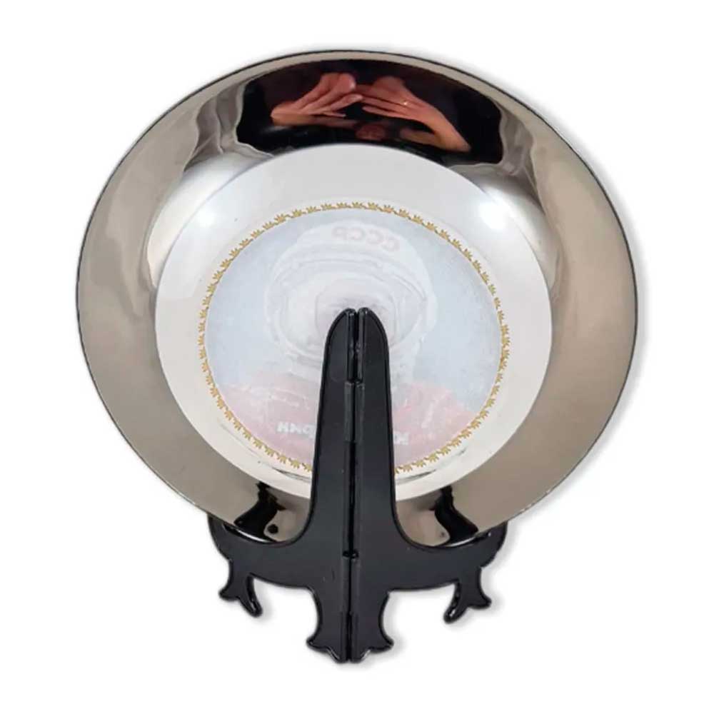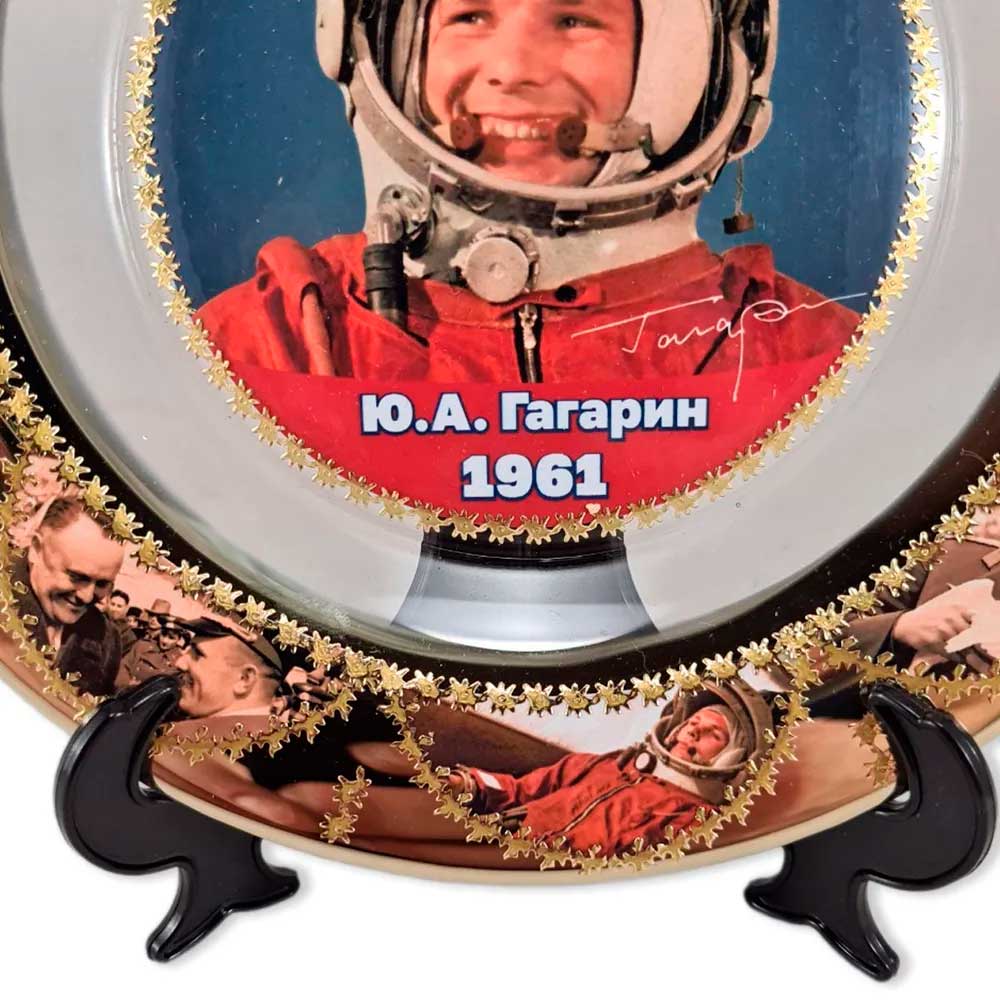 Декоративная фарфоровая тарелка, выполненная методом сублимации, представляет собой коллаж из фотографий самого известного человека на планете - знаменитого советского космонавта Юрия Алексеевича Гагарина. Представленная тарелка, это результат авторской ручной работы. Фотографии - элементы коллажа обрамлены контурами потали. На обратной стороне тарелки имеется специальный пластиковый крючок, позволяющий удобно и надежно закрепить ее на стене. Также к тарелке прилагается специальная полимерная подставка тренога, обеспечивающая ее установку на горизонтальной поверхности. Тарелка поставляется в белой индивидуальной коробке. Диаметр тарелки 20 см.Похожие товары: