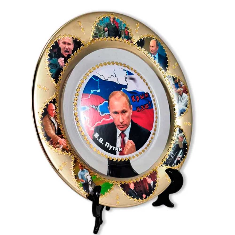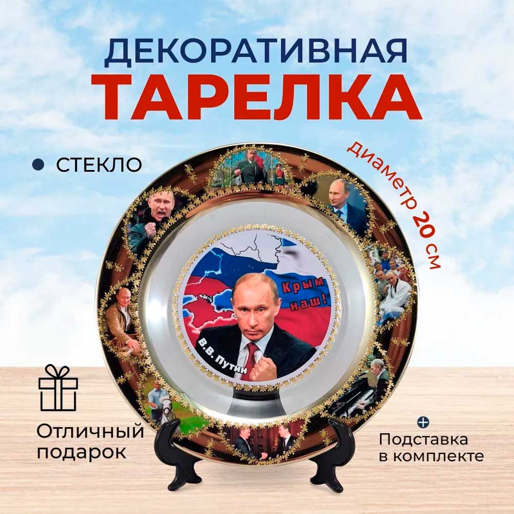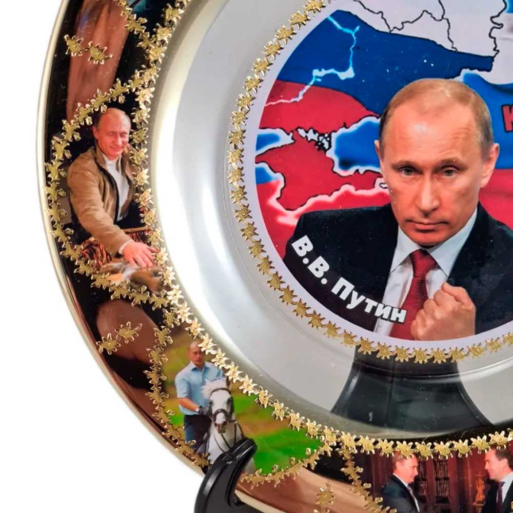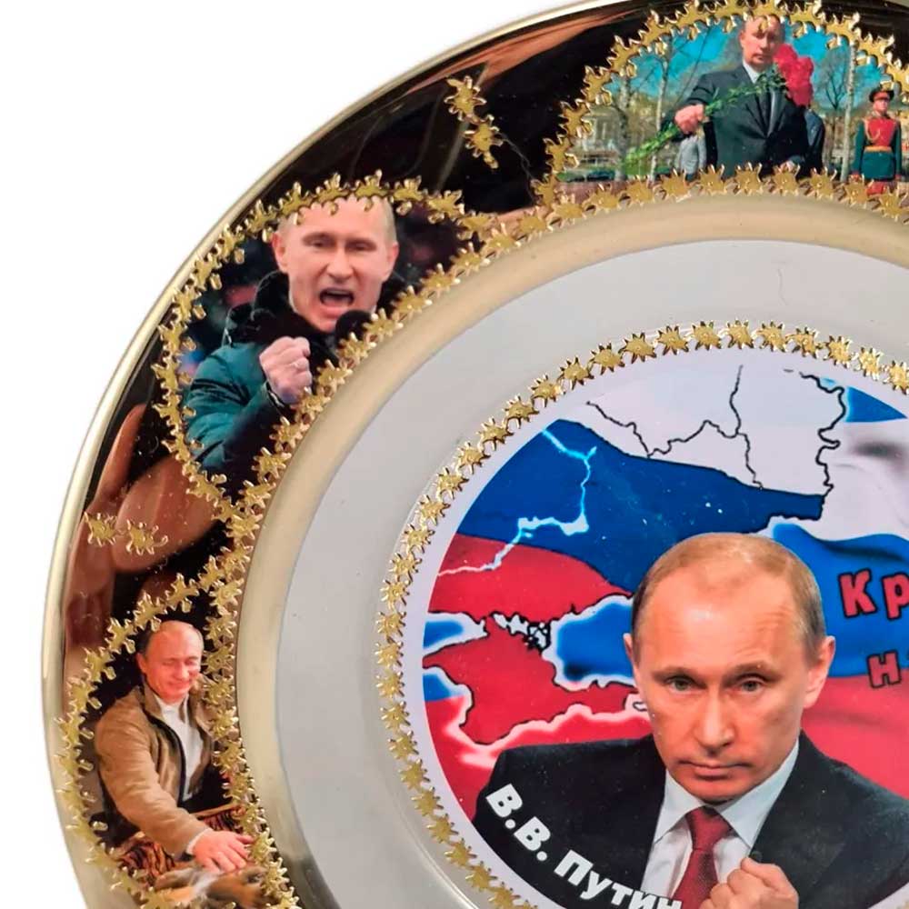 Декоративная фарфоровая тарелка, выполненная методом сублимации, представляет собой коллаж из фотографий одного из самых известных на планете личностей - действующий президент Российской Федерации, председатель Государственного Совета Российской Федерации и верховный главнокомандующий Вооружёнными силами Российской Федерации - Путин Владимир Владимирович. Фотографии - элементы коллажа обрамлены контурами потали. На обратной стороне тарелки имеется специальный пластиковый крючок, позволяющий удобно и надежно закрепить ее на стене. Также к тарелке прилагается специальная полимерная подставка тренога, обеспечивающая ее установку на горизонтальной поверхности. Тарелка поставляется в белой индивидуальной коробке. Диаметр тарелки 20 см.Похожие товары: