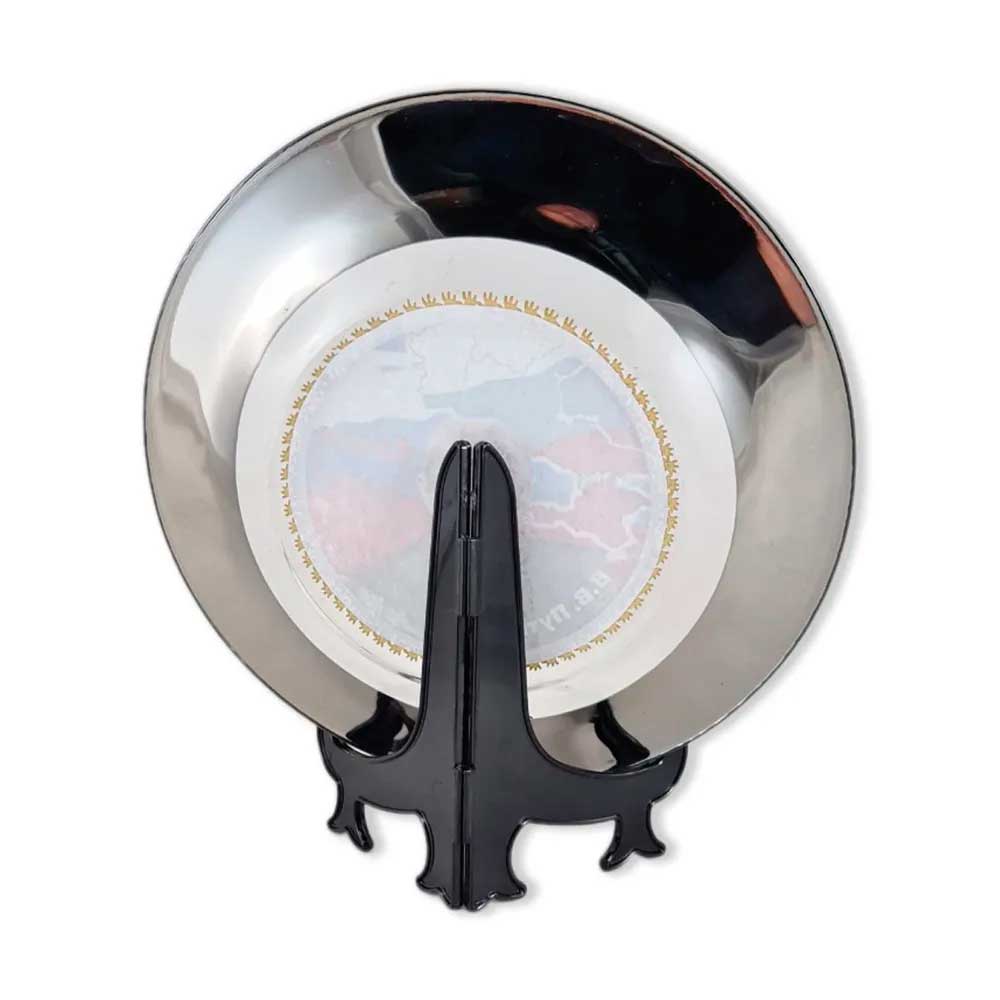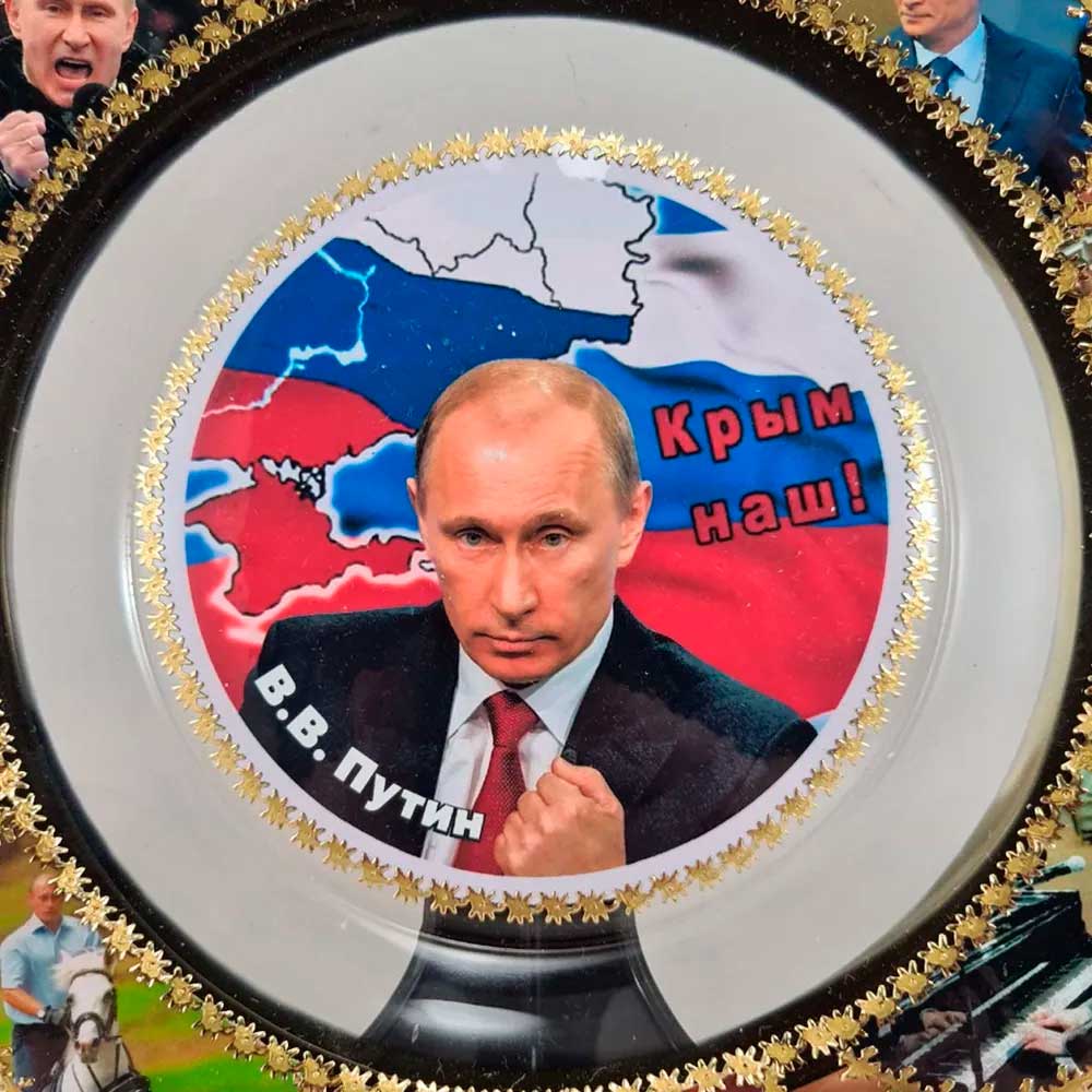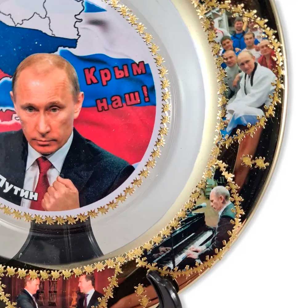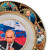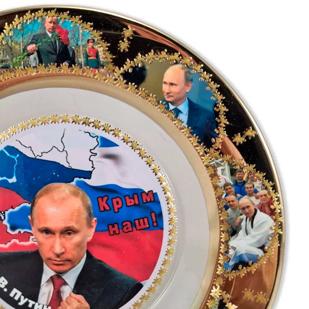 Декоративная фарфоровая тарелка, выполненная методом сублимации, представляет собой коллаж из фотографий одного из самых известных на планете личностей - действующий президент Российской Федерации, председатель Государственного Совета Российской Федерации и верховный главнокомандующий Вооружёнными силами Российской Федерации - Путин Владимир Владимирович. Фотографии - элементы коллажа обрамлены контурами потали. На обратной стороне тарелки имеется специальный пластиковый крючок, позволяющий удобно и надежно закрепить ее на стене. Также к тарелке прилагается специальная полимерная подставка тренога, обеспечивающая ее установку на горизонтальной поверхности. Тарелка поставляется в белой индивидуальной коробке. Диаметр тарелки 20 см.Похожие товары: