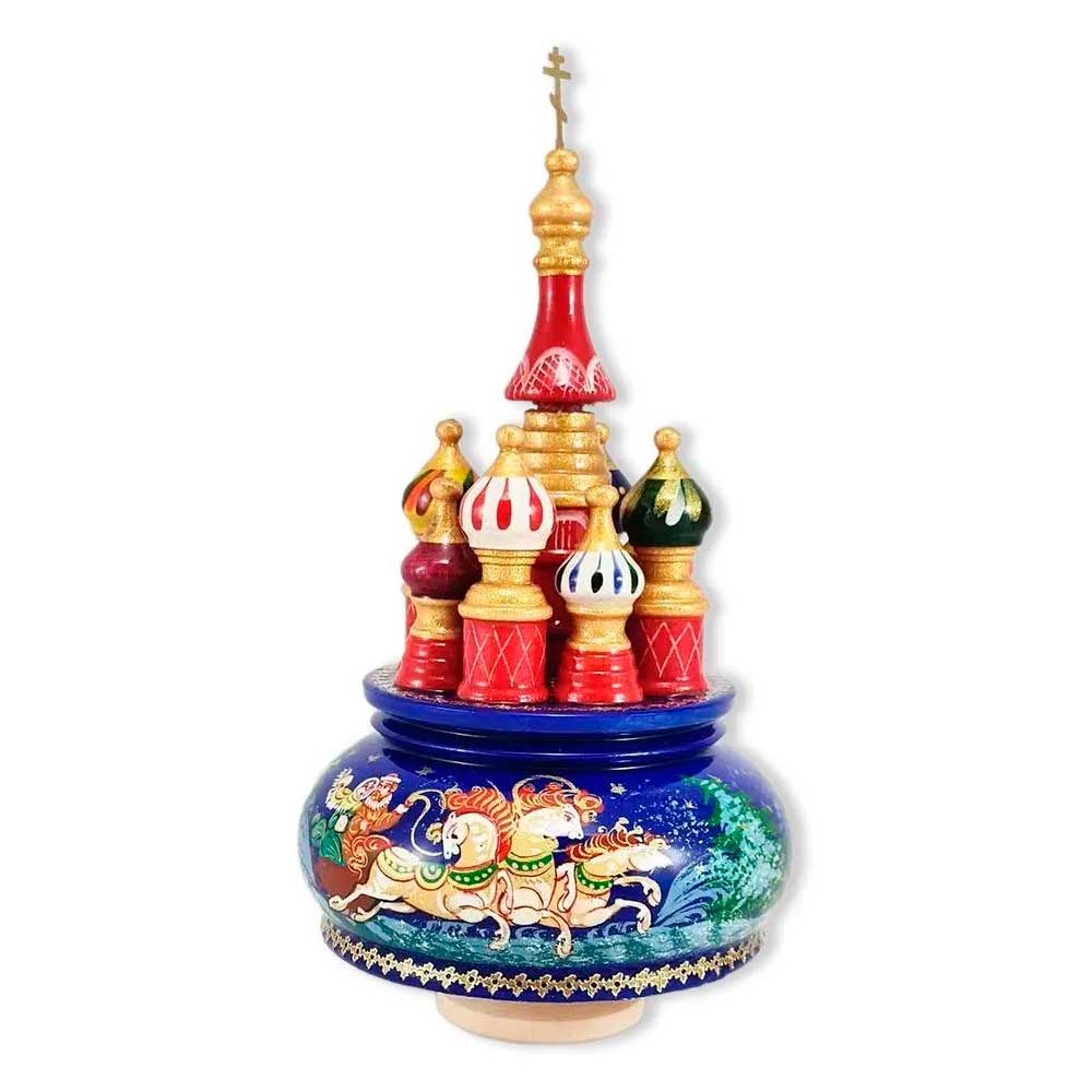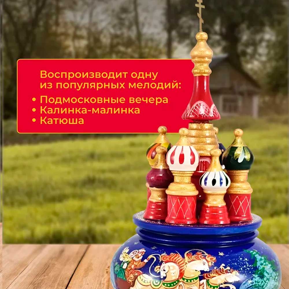 Музыкальный собор из дерева. Верхняя часть сделана в виде Собора Василия Блаженного. Нижняя круглая часть расписана в стиле Холуй - сюдет русская тройка. Внутрь помещен музыкальный механизм. Отличный подарок для ваших близких. Завод происходит подкручиванием ножки. Мелодия музыкального механизма - Подмосковные вечера, калинка - малинка, зависит от имеющейся партии.Похожие товары: