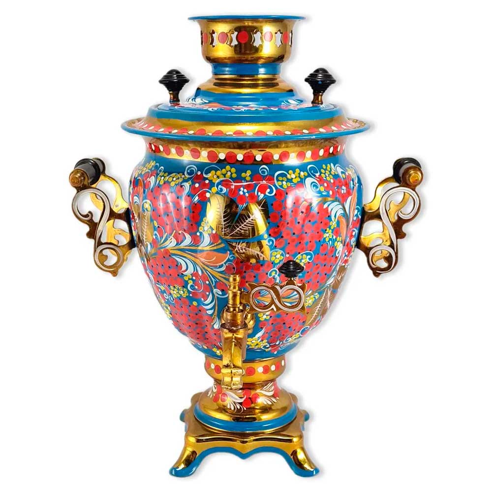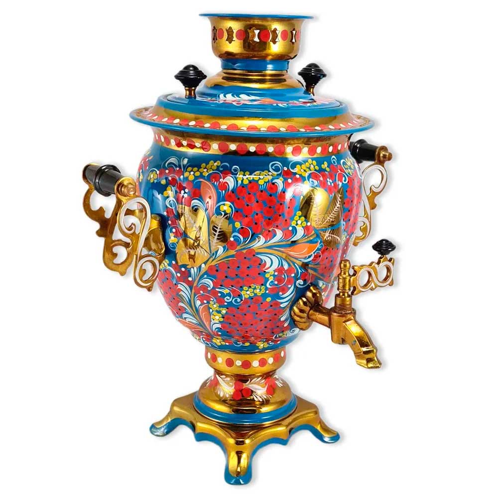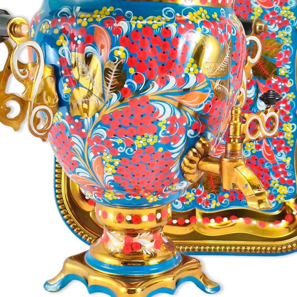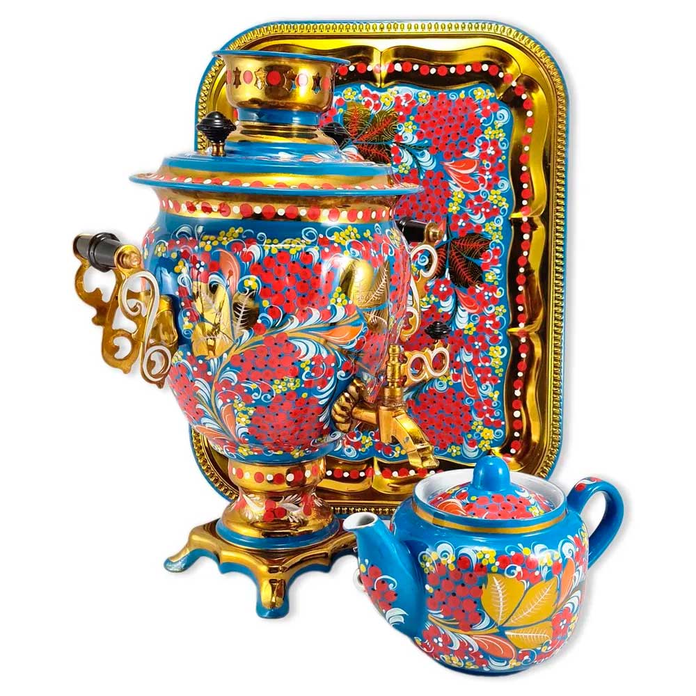 Вы можете купить самовар в стиле хохломской росписи Рябина с доставкой курьером по Москве или почтой в любой регион России или мира. В набор входит электрический самовар, керамический заварной чайник и металлический поднос. Тульский самовар выполнен из латуни. Напряжение - 220 В. Без автоматического отключения. В комплекте поставки металлический поднос и керамический заварной чайник, расписанные в том же стиле и цветовой гамме что и самовар. Производство - Россия, г. Тула. Ручная роспись. Состав набора: Самовар - 1 шт. заварной керамический чайник - 1 шт. поднос - 1 шт. шнур питания - 1 шт.Похожие товары: