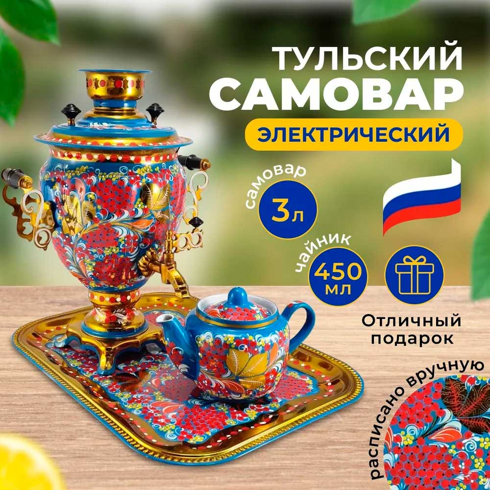 Самовар тульский электрический, Рябина на синем фоне, Желудь, 3 литра