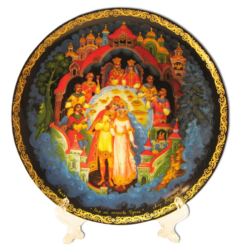 Тарелка декоративная фарфоровая по мотивам русских сказок. Палех "Пир на острове Буяне". Диаметр 20 см. Рисунок горячая деколь. Качественное и долговечное покрытие. Тарелка идет в комплекте с подставкой. Также на обратной стороне есть металлический подвес, с помощью которого тарелку можно повесть на стену. Красивая подарочная упаковка. Отличный подарок на любой праздник. Украшение вашего дома в стиле Русских Народных сказок. Декоративная тарелка погрузит вас в атмосферу сказки и волшебства.Похожие товары:
