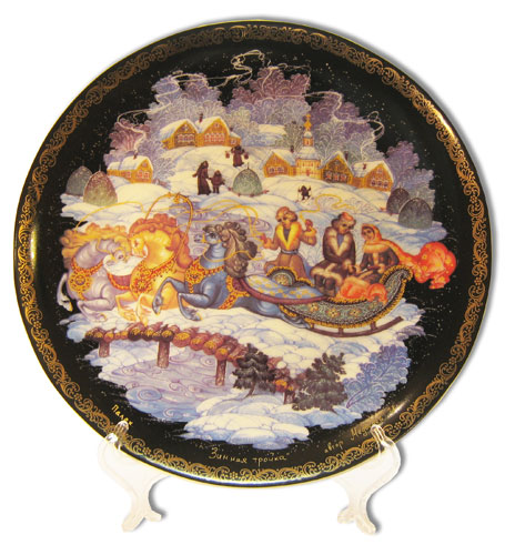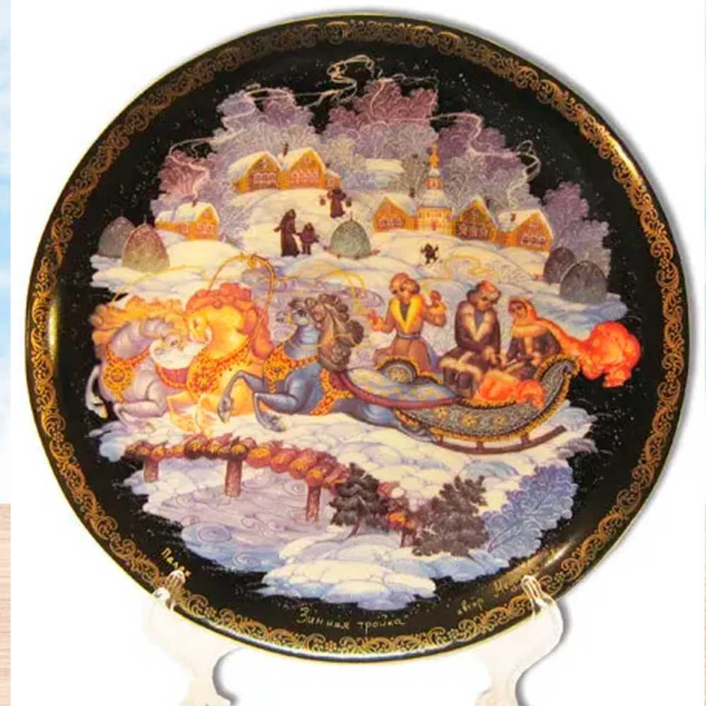 Тарелка декоративная фарфоровая по мотивам русских сказок. Палех "Зимняя тройка". Диаметр 20 см. Рисунок горячая деколь. Качественное и долговечное покрытие. Тарелка идет в комплекте с подставкой. Также на обратной стороне есть металлический подвес, с помощью которого тарелку можно повесть на стену. Красивая подарочная упаковка. Отличный подарок на любой праздник. Украшение вашего дома в стиле Русских Народных сказок. Декоративная тарелка погрузит вас в атмосферу сказки и волшебства.Похожие товары: