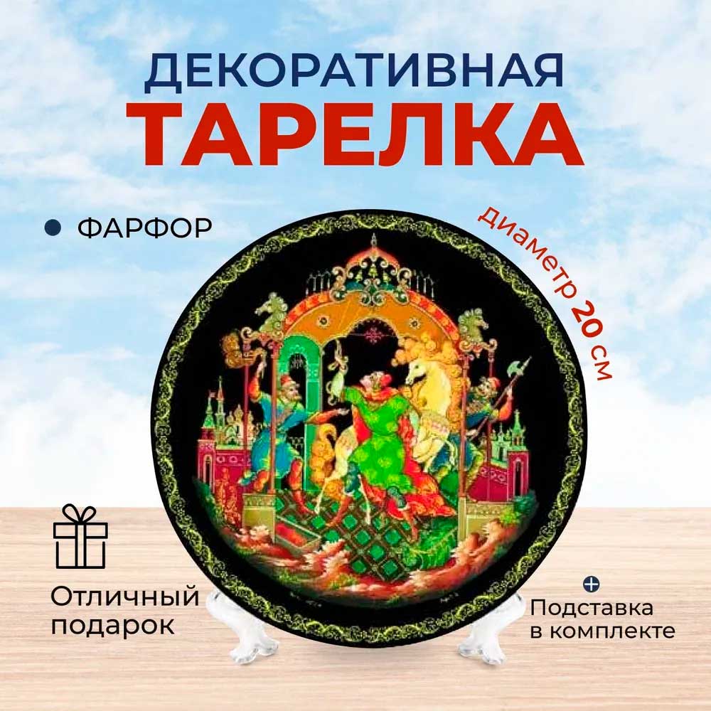 Тарелка декоративная фарфоровая по мотивам русских сказок. Палех "Золотая уздечка". Диаметр 20 см. Рисунок горячая деколь. Качественное и долговечное покрытие. Тарелка идет в комплекте с подставкой. Также на обратной стороне есть металлический подвес, с помощью которого тарелку можно повесть на стену. Красивая подарочная упаковка. Отличный подарок на любой праздник. Украшение вашего дома в стиле Русских Народных сказок. Декоративная тарелка погрузит вас в атмосферу сказки и волшебства.Похожие товары: