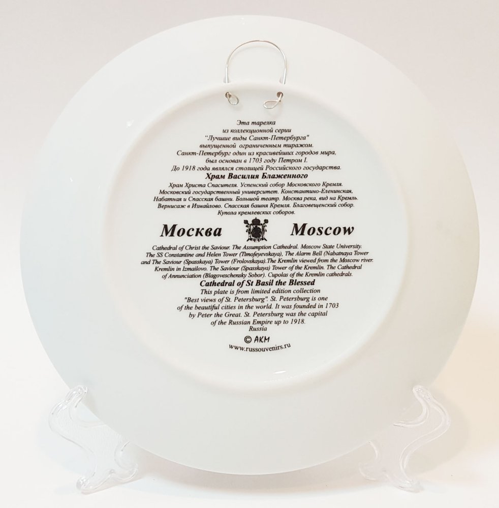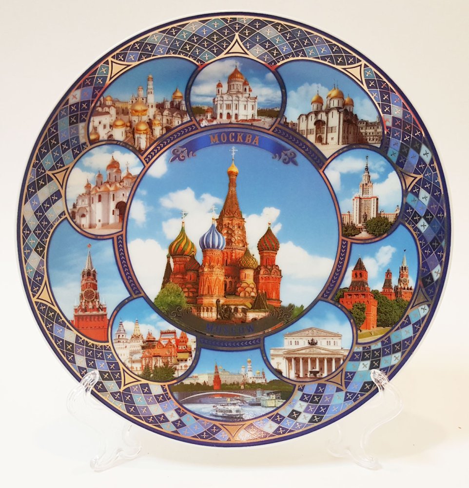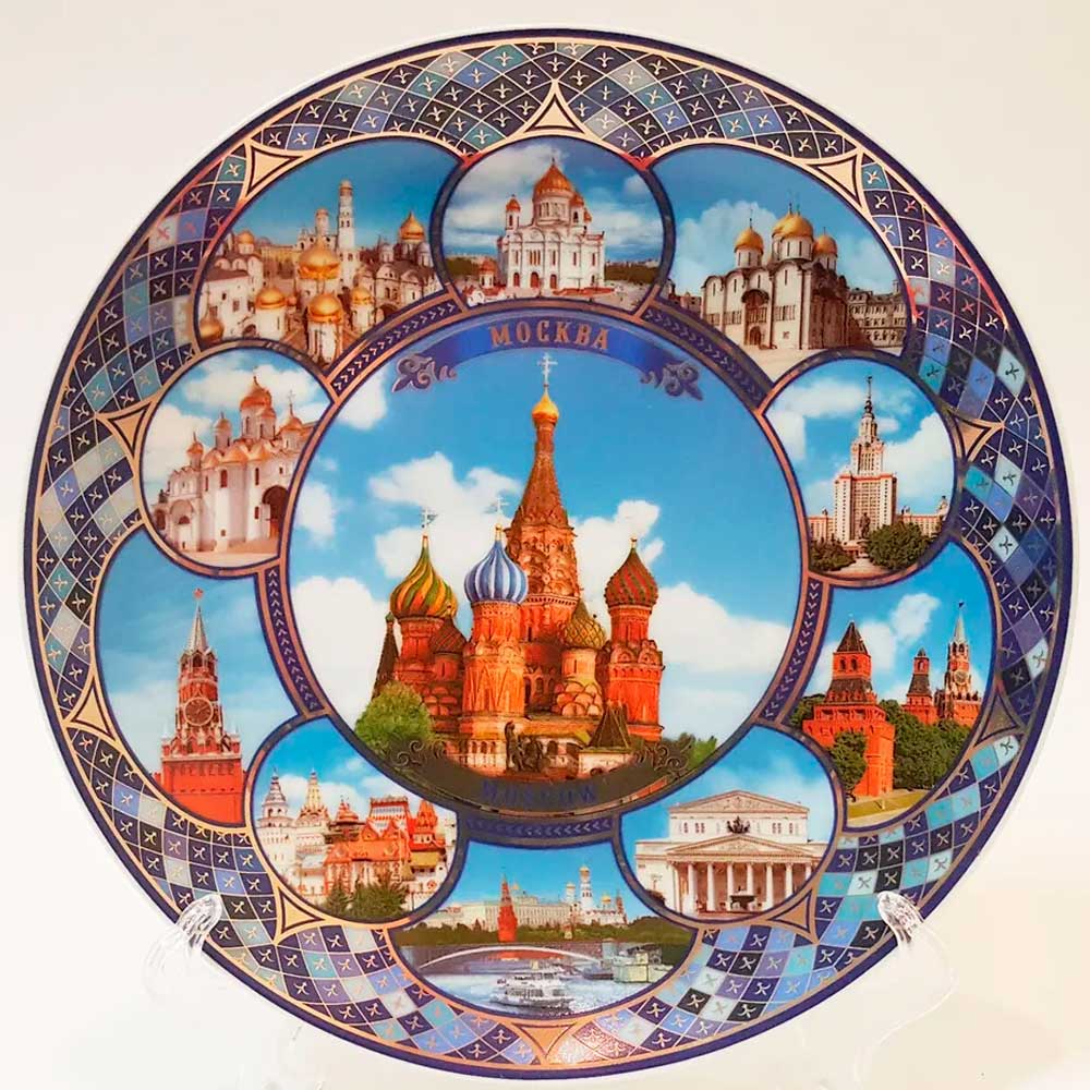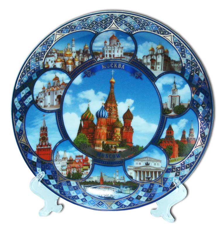 Декоративная фарфоровая тарелка, выполненная методом сублимации, на тарелке изображено "Коллаж №1 Москва", с достопримечательностями Кремля по кругу. На обратной стороне тарелки имеется специальный пластиковый крючок, позволяющий удобно и надежно закрепить ее на стене. Также к тарелке прилагается специальная полимерная подставка тренога, обеспечивающая ее установку на горизонтальной поверхности. Тарелка поставляется в белой индивидуальной коробке. Диаметр тарелки 20 см.Похожие товары: